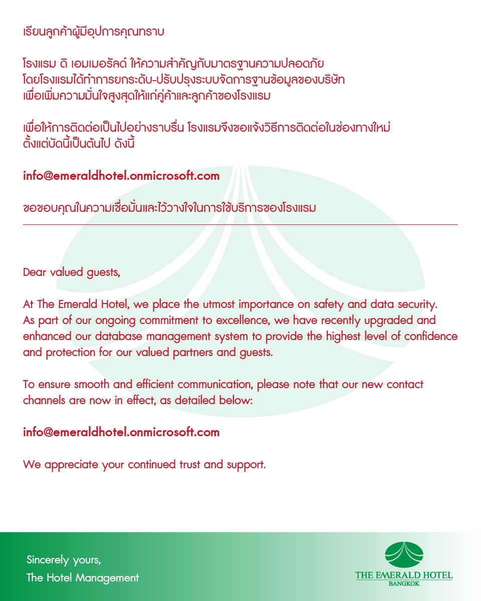 Emerald Hotel Bangkok is the perfect base from which to explore Bangkok during day and night, a short distance to the CBD, Ratchada Rot Fai Train Night Market, the Street Ratchada Avenue, Chatuchak Market, and just 25-minute drive to both Suvarnabhumi and Donmuang Airports.
